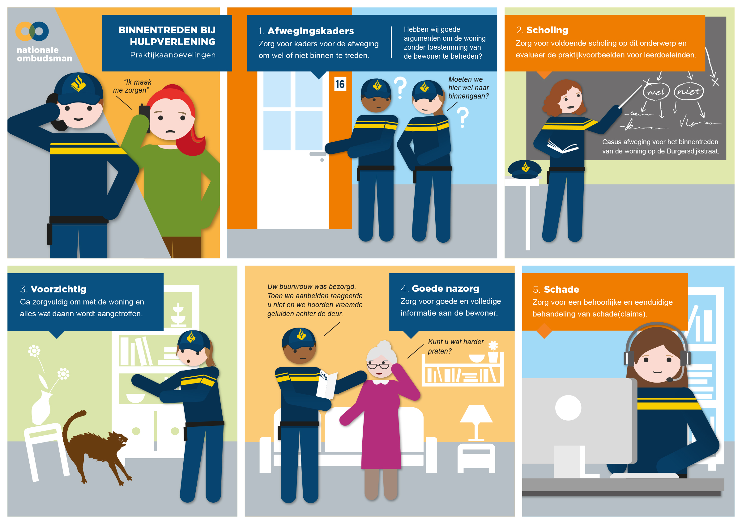 Sinds jaar en dag krijgt de Nationale ombudsman klachten van burgers over binnentreden door de politie in het kader van hulpverlening. Deze klachten gaan over de vraag óf de politie wel mocht binnentreden (de afweging) en over de vraag of de politie wel voldoende uitleg, informatie en aandacht aan deze bewoners heeft gegeven na het binnentreden (de nazorg). Verder gaan deze klachten over de vergoeding van schade als gevolg van het binnentreden.